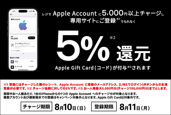 ②チャージ対象期間中にコンビニ店舗にて、レジで100,000円を現金でApple Accountにチャージ。