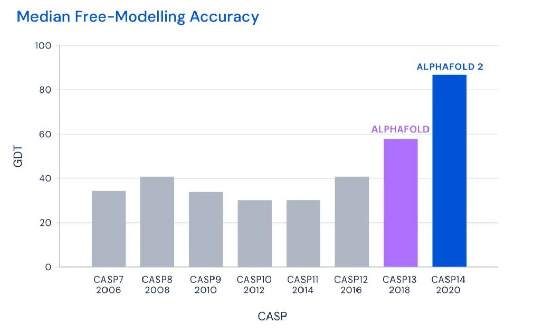Google系列のDeepMind、AIシステム「AlphaFold」で「タンパク質折りたたみ問題」で大飛躍 新薬開発への重要な一歩Alphabet傘下のDeepMindのAIシステム「AlphaFold」が、世界的なタンパク質構造予測コンペ「CASP」で飛躍的なハイスコアを出した。「解明には宇宙の年齢よりも長い時間がかかる」とされる「タンパク質折りたたみ(フォールディング)問題」の解明への大きな一歩だ。www.itmedia.co.jp