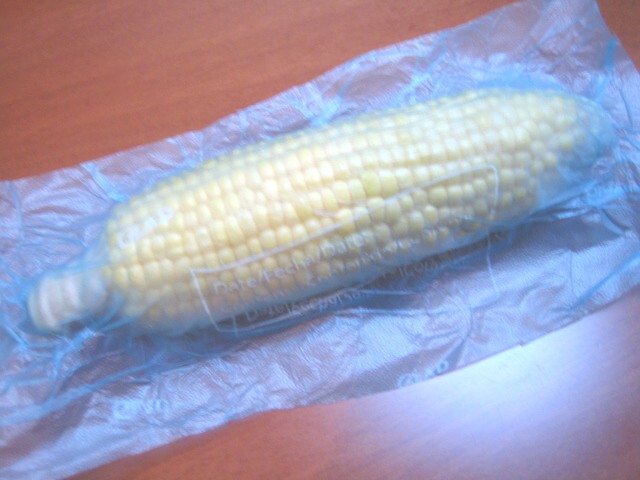 箱にトウモロコシの絵があったので、同じようにつつんでみました。慣れないとちょっと空気が入りましたが、かなり真空パック風に・・。