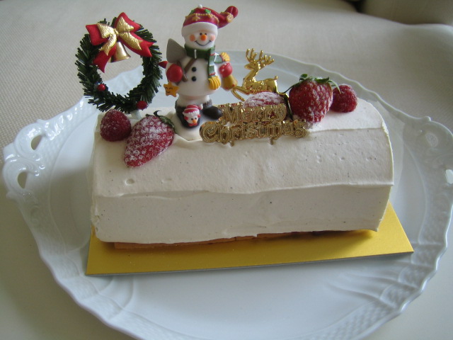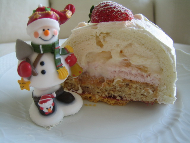 昨年予約して買った”ブッシュ・ブラン”というケーキ。クリスマスケーキは何種類かありましたが、他のものはすべて定番のケーキをアレンジしたもので、ブッシュ・ブランだけがクリスマス用に作ったものということでこちらにしました。毎年不思議に思うのは、普段のケーキはとってもシックで大人っぽいデザイン(?)のToshiシェフですが、クリスマスケーキはなぜか全てがキュートテイスト。なぜ・・・・・??不思議です。ちなみに、こちらのケーキはお味も少々お子様向け。個人的にはいつもの大人っぽいお味のほうがよかったかな。