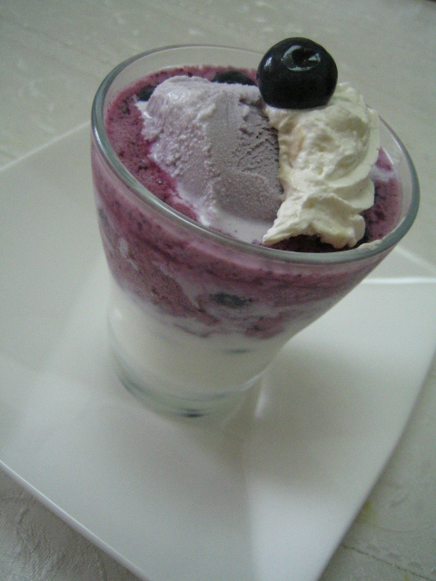 高野の”桃パフェ”と私作の”ブルーベリーパフェ?”です。ゼラチンでゆるく固めたヨーグルトの層(フレッシュブルーベリー入り)の上にブルーベリースムージーの固めのもの、その上にブルーベリーアイスと甘さを控えた生クリームの簡単パフェです。(簡単ですが、だんな様には好評でした~)