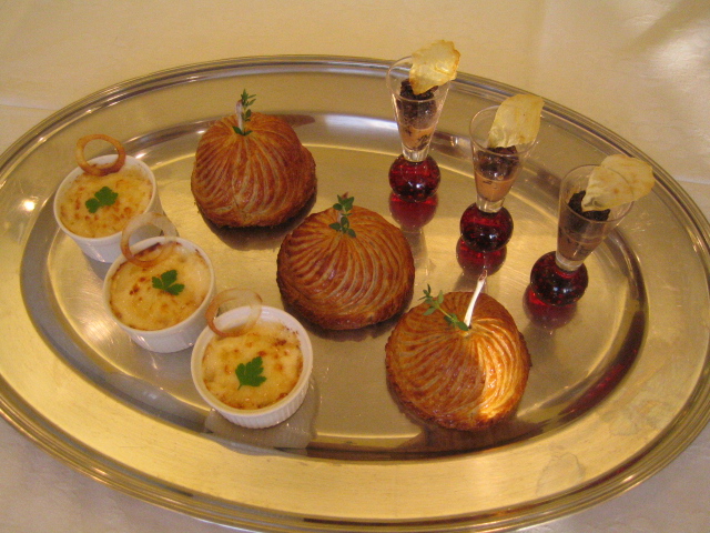 付け合わせはモリーユ茸(フランスのキノコです)をポルト酒とマデラ酒で煮込み、クレメしたものと、根セロリとジャガイモを生クリームで煮込み、じゃがいものでんぷん質だけでとろみをつけたフランスのドフィネ地方の料理ドフィネ風グラタンです。試験終了後には、担当のシェフに今回のお料理は自分が想像していた以上にクラス全体レベルが高く、みなさんがこのようなお料理を作ってくれたことを誇りに思います!という嬉し言葉をいただきました。個人個人へのコメントの際にも、パイの薄さも焼き加減、中のファルスもよくできているし、またパイの仕上がりもとても美しい!と普段、とても厳しいシェフがとっても褒めてくださったのでなんだか感動してしまいました。