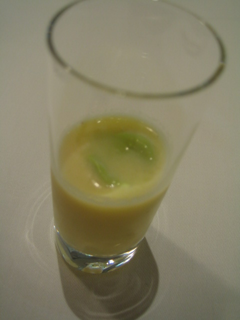 とっても冷たくておいしかったソラマメのスープ仕立てとデザートのキャレ・バナーヌ・キャラメル スパイスミルクのアイスクリーム