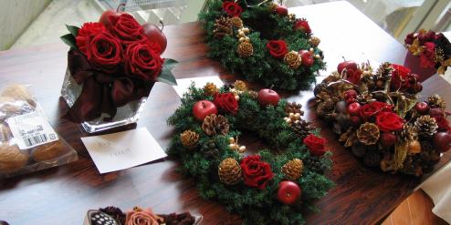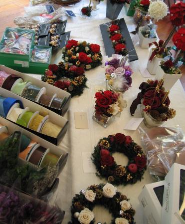 今回のクリスマスマーケットでは、ディプロマを取得された生徒さんたちによるクリスマスアレンジの展示販売を行いました。お資格はとられ、これからお教室を!と考えておられる生徒さん達のチャレンジ企画ですので、作品のお値段も通常ではありえないびっくり価格!いらっしゃったお客様もそのお手ごろさに驚き、お一人で5つ以上もアレンジを買われた方もおられたほど(笑)!