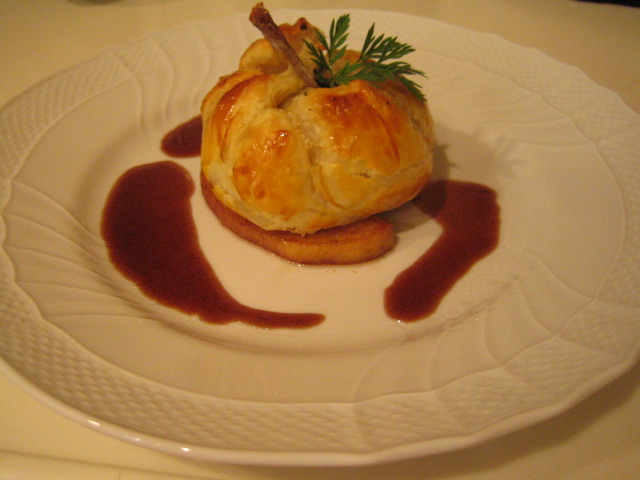 作り終えて、食べ始めたのは11時半こんな時間にバターたっぷりのパイ生地包みなんて・・ (´▽`)笑うしかない感じです。しかも、なかなかうまくはいきませんね。某レストランでこんな丸い形のパイ包みを出すところがあり、とてもパイがうすく軽くておいしい!とどなたかが書かれてルグルメブログを読んで、”この形、かわいいし、丸く包むなら簡単かな”と容易に考えてとりあえずやってみたのですが・・・いやはや、たいへんです。重なった生地の部分に厚みが出てところどころ生地の火通りが悪いところがあるし、かといって重なった部分を切り取りながら作ったほうは、切り取って継ぎ目が浅かったところははがれてくるし・・やや失敗気味。パイ包みは大きいものの方が簡単だと思うけど、盛り付けが大きなオーバルの1皿に3人分、プラス1人分を普通のお皿に・・と2種類の盛り付けをしないといけないので、やはり1人分づつ作るしかないかも・・・。でも、とりあえず、1度作ってみて中に詰めるファルスとソースのほうは考えがまとまってきたので、よしとしましょう。2日目の試作は、写真はないのですが、パイ生地をもう少し薄くのばし、包み方も変えてみたら、パイの焼きむらはなくなり昨日よりはかなりおいしくなりました。まだ、パイ包みにするか中の骨を抜いてファルスをつめてローストにするかは迷っていますが、しばらくはウズラと格闘する日々は続きそうです。