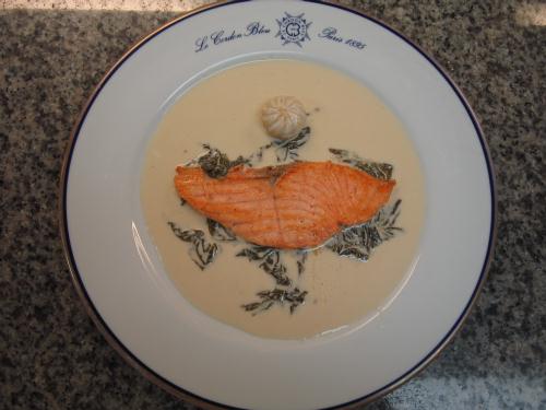 ご存知の通り、コルドンレポートもすっかりお休みしてしまっておりますが、11月から始まったレッスンも今では17回目を終え、あと残すところ4回で基礎コースも卒業です。基礎コースというと、なんだか簡単な感じがしますが、先日フランスの3星レストラン”トロワグロ”のスペシャリテ、”サーモンオゼイユ(Escalope de saumon a l'oseille)”(世界一有名な料理とも言われているらしいのでご存知の方も多いかと思いますが・・)を作りました!トロワグロは、リヨンからさらに電車で2時間ほど離れたロアンヌという田舎町にあり、と~っても不便なのですが、以前、フランスに旅行したさいに、このサーモンオゼイユを食べるため(というかトロワグロに行くために)わざわざパリから足を伸ばして行った思い出があります。パリからリヨンまで飛行機、そこから電車でロアンヌまで・・それはそれは果てしない道のりでした・・。実は、今、コルドンブルーでお料理を教えていただいている山下シェフはこの”トロワグロ”にもいらっしゃった方なんです。そういうわけで、私の習ったサーモンオゼイユはまさに本物!だけあって、自画自賛で恐縮ですが、実習後、自分の作ったお料理を試食して、”おいしい~!”と声をあげてしまいまったくらいです。シェフからは、トロワグロで食べたのと同じようにできましたか?”と聞かれましたが、お恥ずかしい話、トロワグロで食べたのは今から4年近く前なので、ぜんぜん味を覚えていないのです・・。しかも、悲しいことにトロワグロへの道のりがあまりにも長かった上、そちらに立ち寄るために旅がハードスケジュールとなってしまったため、疲れで胃が弱っていたのでしょうか・・私もだんな様も2人とも見事におなかをこわしてしまったのです。(完食したフルコースの量が多すぎたとの噂もありますが・・)そういうわけで、翌日はひどい腹痛に悩まされ、味を覚えているどころではなかったのです(笑)←この話、今では笑い話ですが、その時は、私は比較的症状が軽かったのですが、だんなさまのほうは、ロアンヌの後にいったドイツでまで症状をひきずり、腹痛の上発熱してしまうほどどんどん症状が悪化し、食中毒かと思ったくらい・・。もっていた簡単な風邪薬では効果は現れず、私一人で全く英語の通じないドイツの薬局で薬を買うのに四苦八苦した大変な思い出さえあるくらいです。本当に、その時は笑い話どころではなかったんです!(笑)と、話が脱線しましたが、そんなたいへんな思い出のある一皿なので、実習後に持ち帰ったサーモンオゼイユは自宅でだんな様と2人であの日のディナーのやり直しということで試食してもらいましたが、”とてもおいしい”と喜んでくれた時は、コルドン・ブルーに行ってよかったなぁ・・!とちょっと嬉しくなってしまいました。こちらがその”サーモンオゼイユ”です。