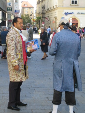 そして、そんな観光客に声をかける怪しげなモーツアルト達・・・(笑)どうやらモーツァルト生誕200年祭とかで、いろいろなところで、ミュージカルなどを催しているみたいで、そのチケットを売っている方たちみたいです。・・・と、また夜更かししてしまいそうなので、今日はこれくらいで。近日中に続きのレポートアップしますね!お楽しみに!