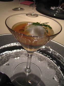 <小かぶとフォアグラのフラン赤座海老添え トリュフの香り豊かなコンソメと共に>こちらは少々和風なお味。和食のお店でかぶとフォアグラあわせたもの時々でますよね。そんな感じ。フォアグラはフランにしているからかとってもあっさり。エビの火の入れ加減がさすがでした。