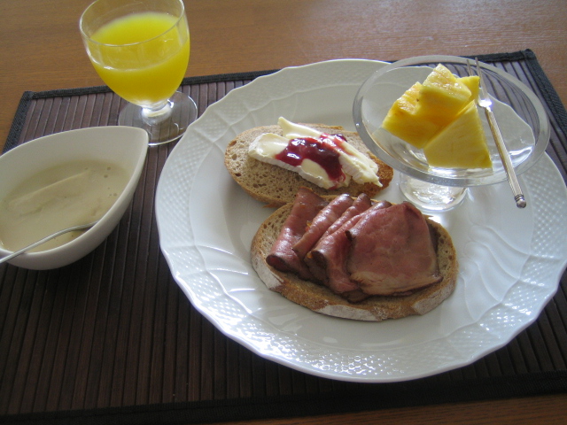 一人のときは、ついつい簡単なものになってしまいますが・・・パン・ド・カンパーニュのオープンサンドと昨日の夜の冷製スープと、オレンジジュース。繊維質もね!とパイナップル。少なめなので、3時頃おなかが空いてくるかも(笑)