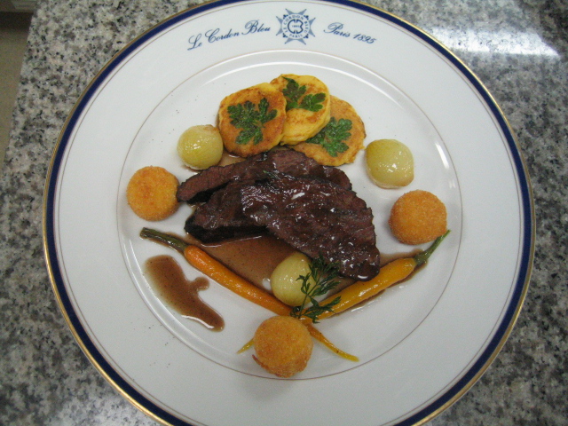 そしてこちらが今日の実習。牛頬肉のブレゼ。実習時間の関係で1時間半くらいしかオーブンにいれられませんでしたが、しっかりやわらかくなりました。本当は3時間くらいかけて調理するともっとおいしくなるそう。付け合わせはトウモロコシで作ったパンケーキと丸いのは、チーズをフライにしたものです。