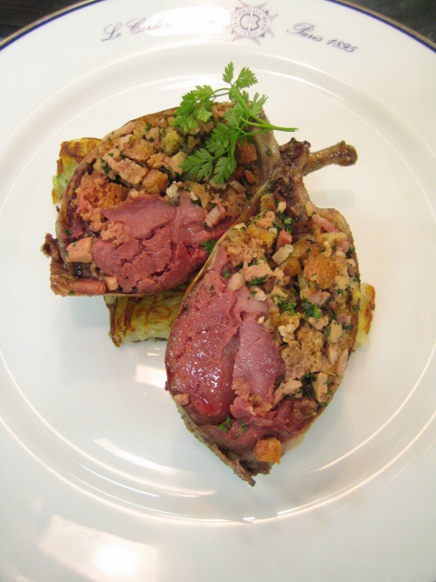お料理の仕方は、鳩の骨を抜き取っておなかの中にフォアグラやベーコン、クルトンなどの具をつめこみ、もとの形に戻してオーブンで焼き上げます。