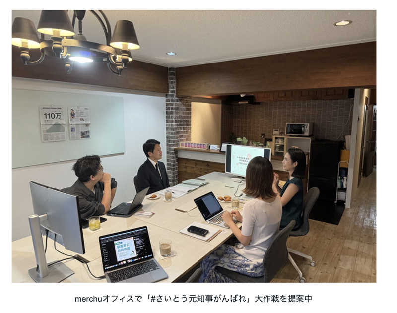 《とある日、株式会社merchuのオフィスに現れたのは、斎藤元彦さん》と斎藤知事が折田氏の元を訪ねて、SNS戦略の依頼をしているシーンの写真だけでなく、《兵庫県知事選挙に向けた広報戦略のご提案 #さいとう元知事がんばれ》という「提案資料」がブログには掲載されている。