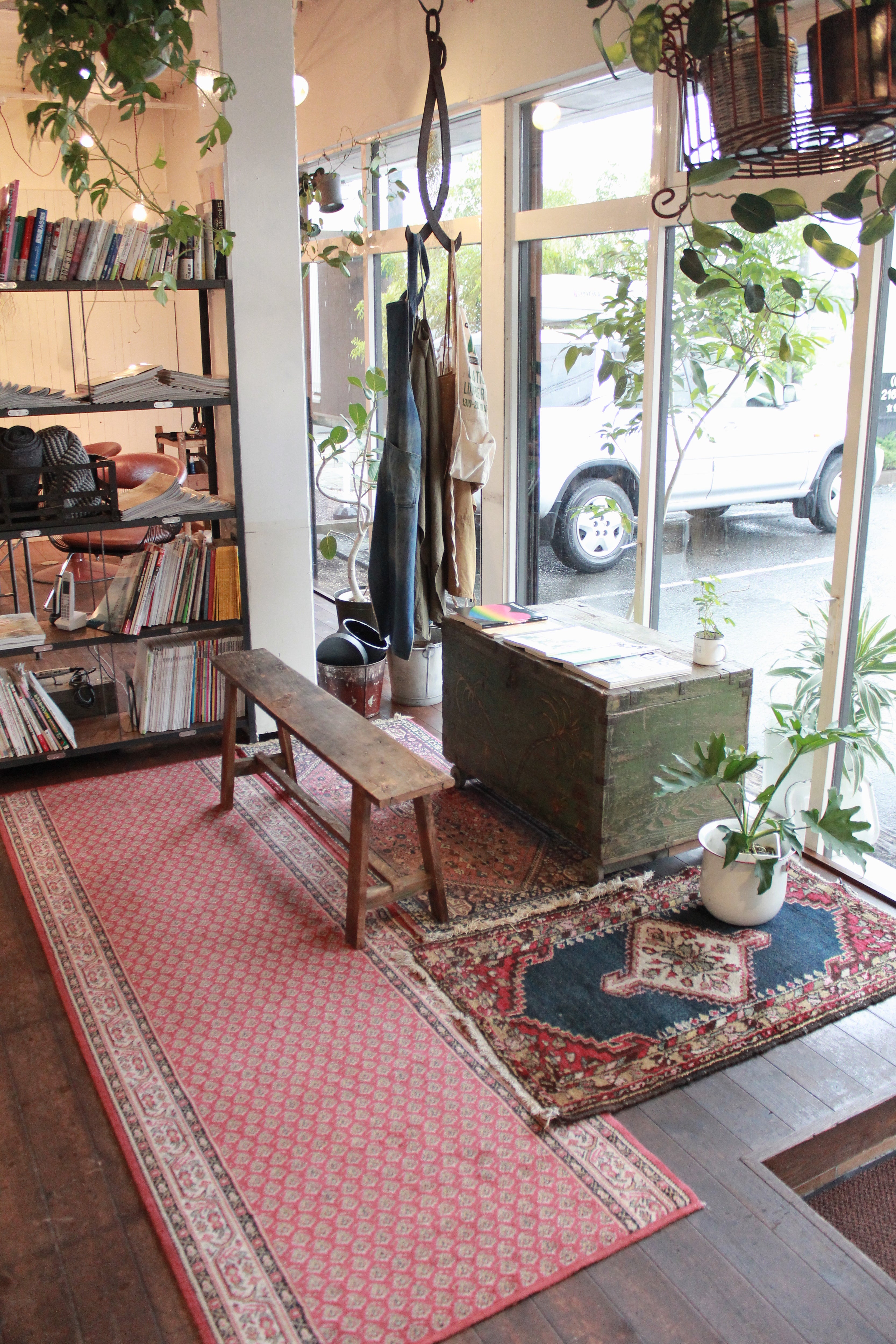 その下のラグはベルギーのヴィンテージ。イギリスに来た移民が使用していたとみられるウッドボックスもかなり古いとのこと。今はプリミティブベンチが置いてありますが、雰囲気の合うソファがそのうちここに入る予定です(現在探し中)。