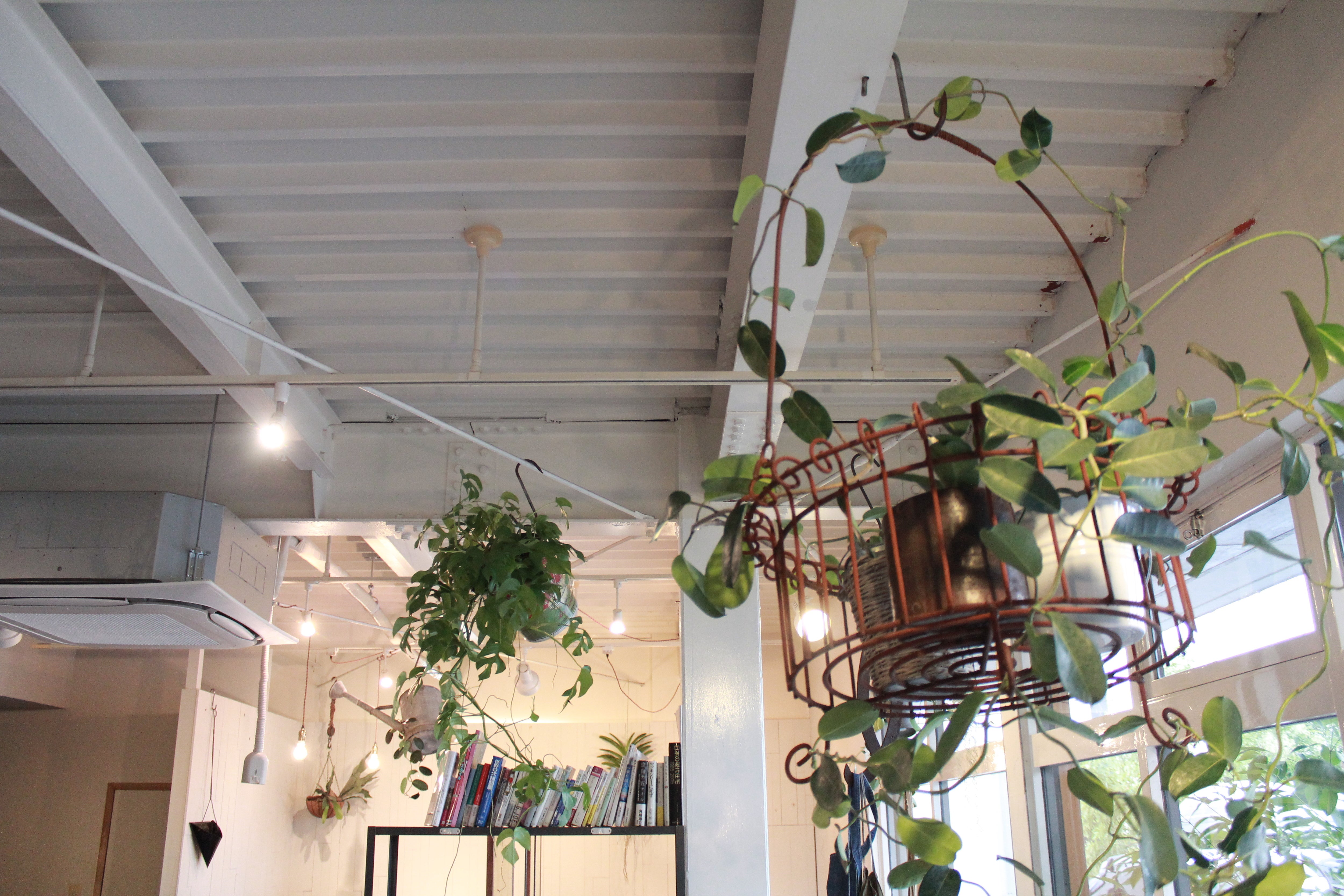 天井から吊り下げのプラントバスケットはメキシコの物。かなり古いそうです。さびさび過ぎて友達にびびられましたけどね。グリーンはマダガスカルジャスミン。退廃的な鉄の錆に対照的な生き生きとしたグリーンの組み合わせが良い雰囲気で気に入ってます。