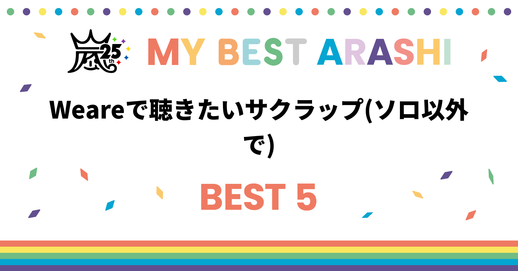 Weareで聴きたいサクラップ(ソロ曲以 外で)2月10日現在全部聴きたいけど、一曲でも歌ってくれたら泣くFlash backのサクラップ、すごい好きなんだけどコンサートには向かないかな↓から試聴できますWeareで聴きたいサクラップWeareで聴きたいサクラップ(ソロ以外で) BEST 5 | MY BEST ARASHIあなたの「MY BEST ARASHI」を作って、ぜひ教えてください。my-best-arashi.jpグッズ通販も始まり、ツアーが近づいてきましたねその先を思うと寂しくて情緒不安定になるけれど、今を楽しもう嵐がいる風景。111日