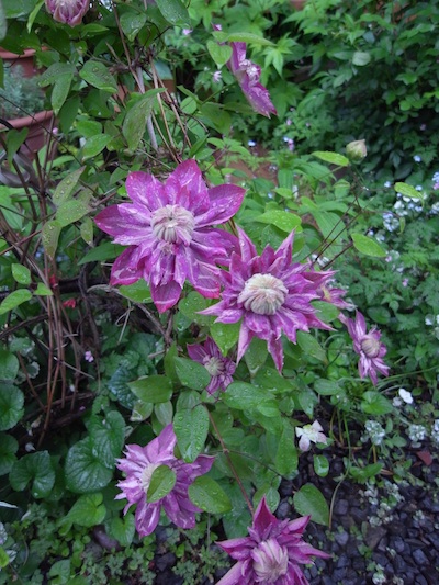 二番目のバラ「ブラッシュブールソール」早咲きの一季咲きです。トゲが無いから通り道でも 窓辺でも大丈夫。香りはあまりありません。細長いつぼみが優雅です。久々の雨で庭中が潤ってくれて良かった。メギの花も可愛いです.クレマチス「カイゼル」咲きました。