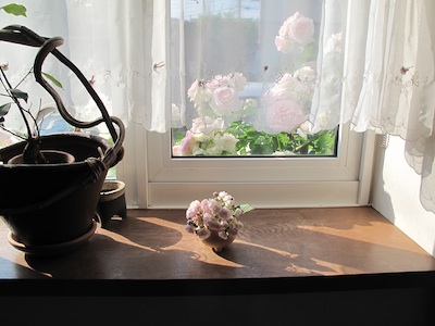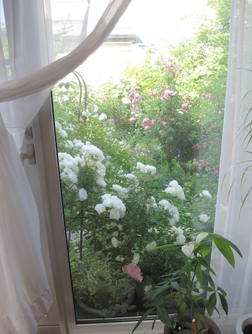 オープンガーデン後半戦窓辺から見たピエール・ド・ロンサール室内からの画像ってもしかして初めてかも?サマースノー 枝垂れさせてます。今年は焼き杉のつっかい棒を何本か立てました。庭の奥へ向かう通路ペネロープがぐんぐん育ってしまいました。左側 白「ブラン・ダブル・デ・クーベル」「ビレッジメイド」紫は「ヴァイオレット」 奥のピンク「ボウベルズ」、チャールズ・レニ・マッキントッシュ 等