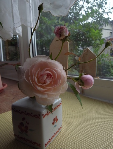 花瓶窓辺のバラ。「セルズ・ムルチフローラ」昨年からずいぶん花瓶を壊してしまいました。猫や、風のおかげで涙、涙。お気に入りのピッチャーが二個なくなりそれに代わるものがなかなかありません。昨日は骨董屋さん~リサイクルやさん廻りました。