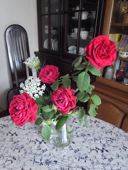 真夏のバラ真夏のバラ 「ダン・ポンセ」キラキラです深紅のバラ「ウインショッテン」と 道端でつんできたノラニンジン。ノラニンジンって名付けたのは牧野富太郎先生。でも、これ、「アン王女のレース」ってすてきな別名があります。