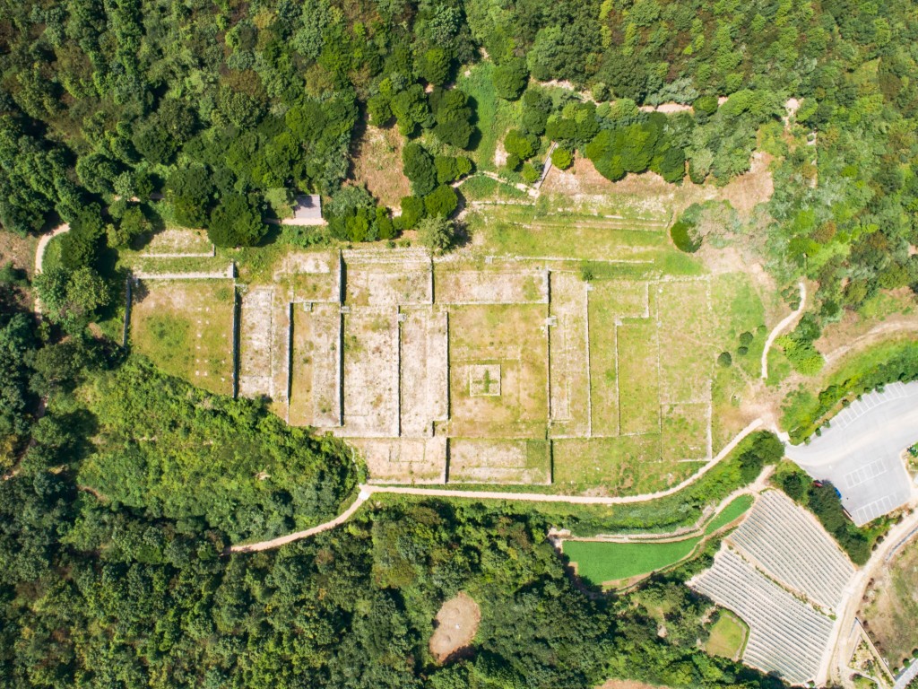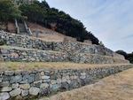 ▲ 宮殿跡西側の土砂崩れ補強3段築石。