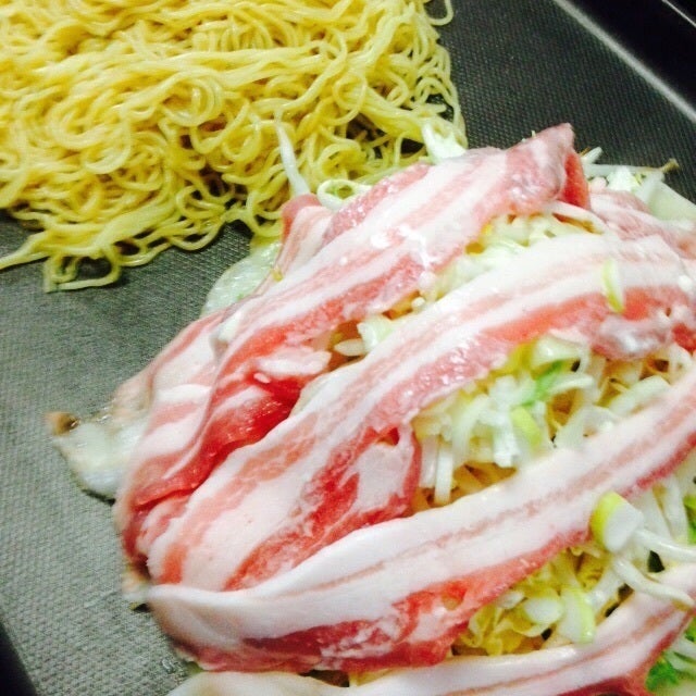 横でいためた焼きそ場に、ウスターソースをまぜて