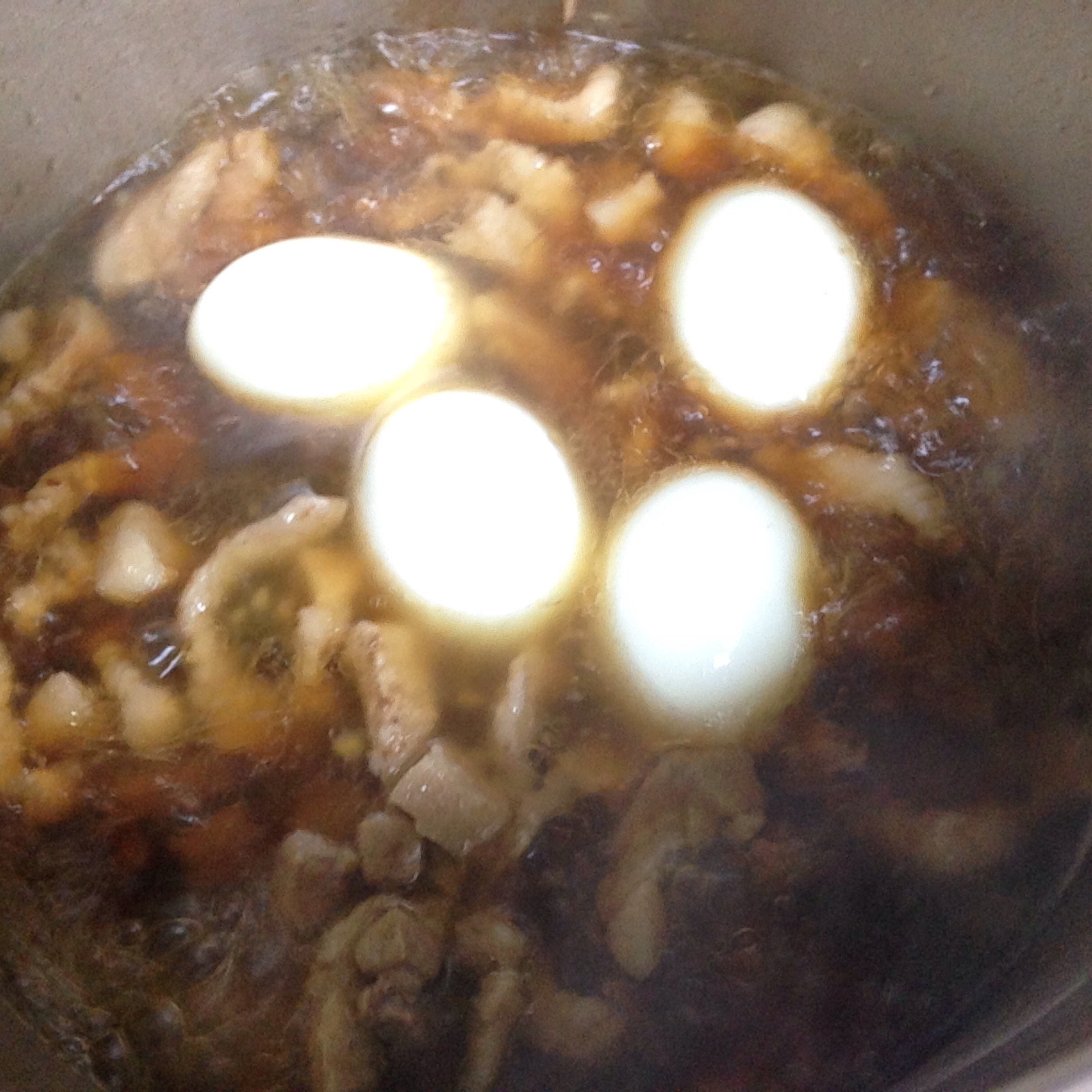 砂糖大3 しょうゆ酒大4 五香粉すこしだげいれて水500cc弱をいれて煮込む