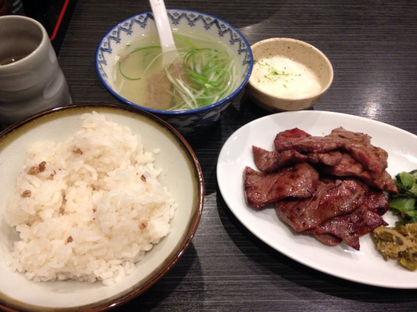 ▲ここはベタに熟成牛タン1.5人前を注文。セット内容はねぎしに似ているなあという印象。ライスはこだわりのこがし麦飯というもの。