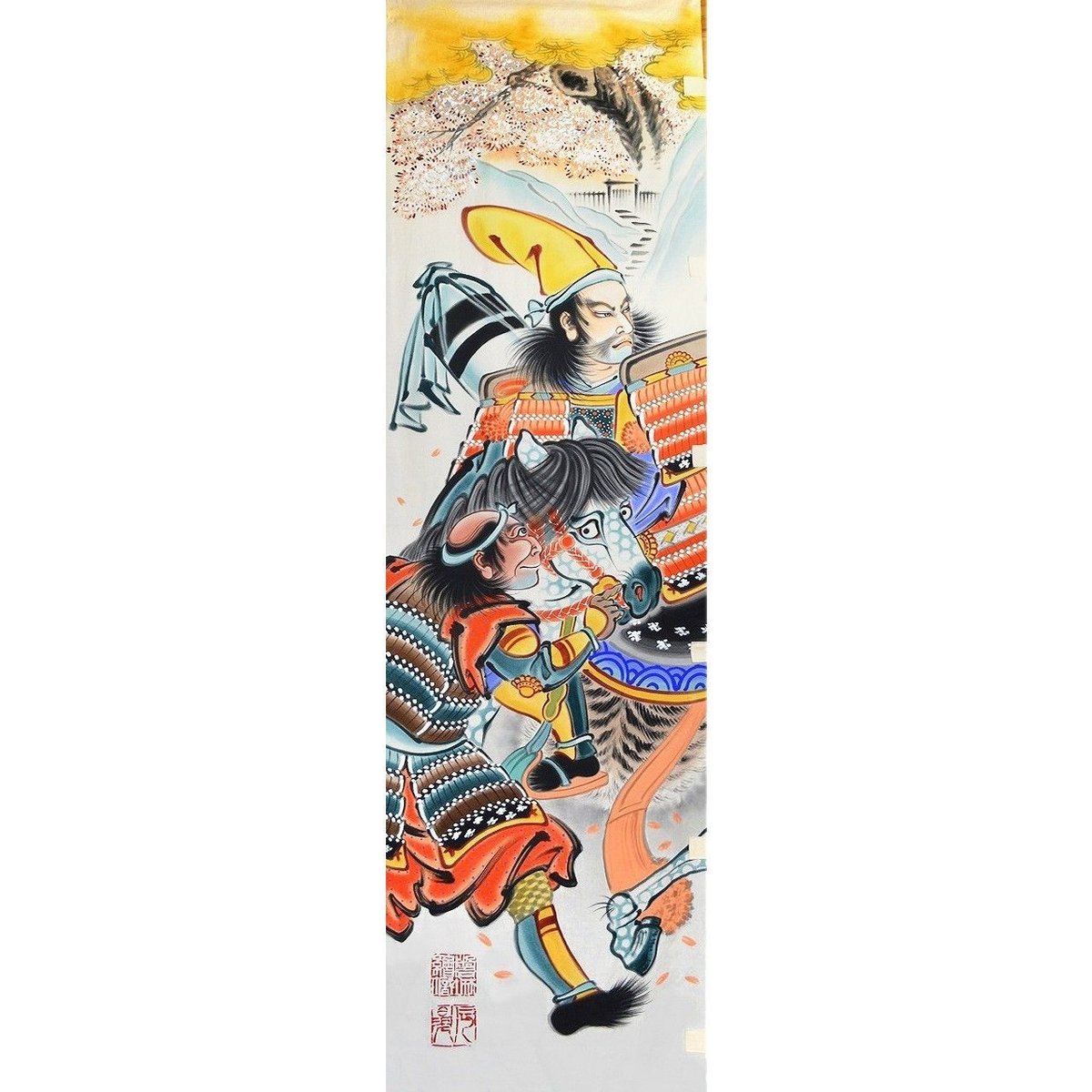 いわき絵のぼり 屋外絵幟『八幡太郎勿来の関』4.5m×0.7m 文武両道いわき絵幟三代目辰昇作 総手描き 文武両道の図柄 八幡太郎は文武両道でたくましい子供に育ってほしいとの願いを込めて節句幟に描かれます。 奥州討伐の際にいわきの勿来の関を通過する際に歌を詠んだ場面を描いております。 【吹く風を 勿来の関と思へども 道もせに散る 山桜かな】 八幡太郎義家(1039-1106)本名:源義家 将軍源頼義公の長男 御注文頂…tohgetsu.stores.jp