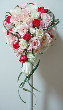 白~ピンク~朱系バラを散りばめたかわいいタイプのブーケを。