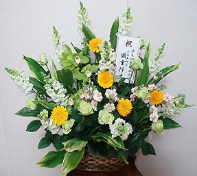 お祝いのアレンジというと黄色や赤やショッキングピンク!