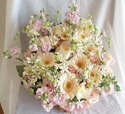 春らしい淡いピンクのアレンジメントをご両親の結婚祝いのプレゼントとして。