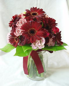ボルドー色のガーベラを使ったクラッチ(束ねた)ブーケ。