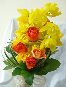 鮮やかなイエローベースで丈長めのクラッチブーケで