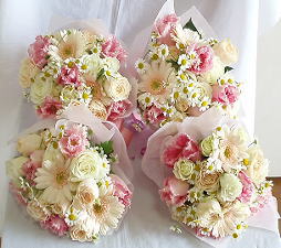 ふんわりとした白とピンクのミニ花束。4月3日挙式予定のお客様のお姉さまから