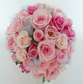 ピンクバラとチューリップのラウンドブーケ。