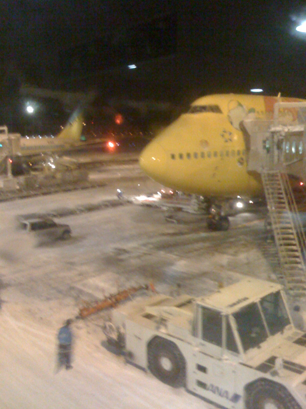 始発のって7:00の飛行機だったが、現地雪のため19:00発に。