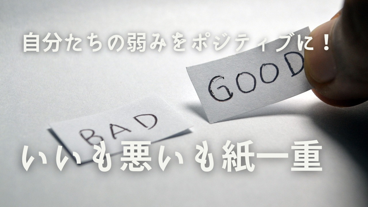 いいも悪いも紙一重!自分たちの弱みをポジティブに変えてみよう!研修の課題で「会社の弱みを、ポジティブに表現する」というものがありました。 いい事も悪い事も紙一重と言いますが、これもそうかなって思います。 だから弱みも捉え方しだいでは、ポジティブになる。 ポジティブで発言できるといいですね! いいも悪いも紙一重!自分たちの弱みをポジティブに変えてみよう! | 江口組|石川県小松市|土木工事の施工・建設業eguchi-gumi.jp