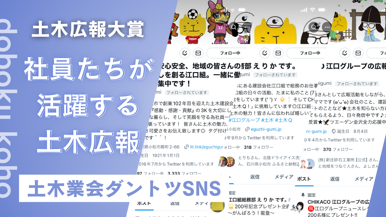 土木業界ダントツSNS。社員たちが活躍する土木広報土木広報大賞2023で江口組の「土木業界ダントツSNS」が企画部門準優秀賞を頂きました!ありがとうございます♪社員たちみんなで土木の魅力を発信し続けたSNSの活動が評価され表彰を頂くこととなりました。みんなの頑張りが評価頂き嬉しいっす!月曜は表彰式。楽しみっす!土木業界ダントツSNS。社員たちが活躍する土木広報 | 江口組|石川県小松市|土木工事の施工・建設業eguchi-gumi.jp