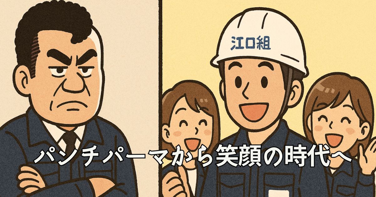 パンチパーマから笑顔の時代へ。江口組の変化今の江口組をご存知の方からは、ちょっと想像がつかないかもしれませんが、昭和の頃の江口組は、社員の3分の1がパンチパーマという、なかなか“いかつい”会社でした。 工事現場でパンチパーマの社員がずらり。 とにかく、見た目のインパクトはすごかった(笑) パンチパーマから笑顔の時代へ。江口組の変化 | 江口組|石川県小松市|土木工事の施工・建設業eguchi-gumi.jp