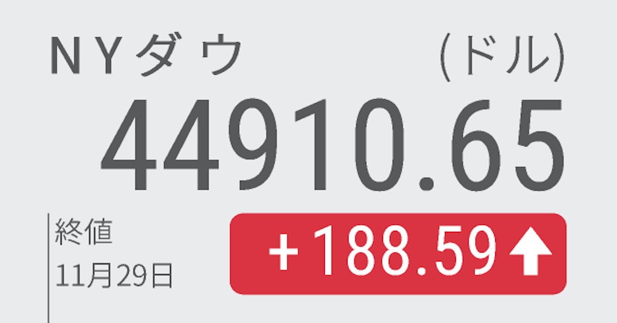 11月29日の米株式市場でダウ工業株30種平均は反発し、前営業日の27日に比べ188ドル59セント(0.42%)高の4万4910ドル65セントで終えた。