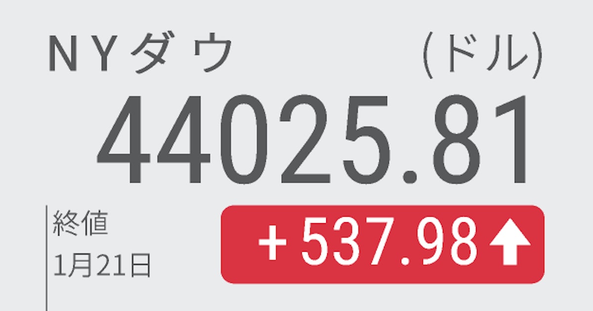 トランプ政権の発足後初の取引となった21日の米株式市場でダウ工業株30種平均は続伸し、前日比537ドル(1.2%)高の4万4025ドルで引けた。