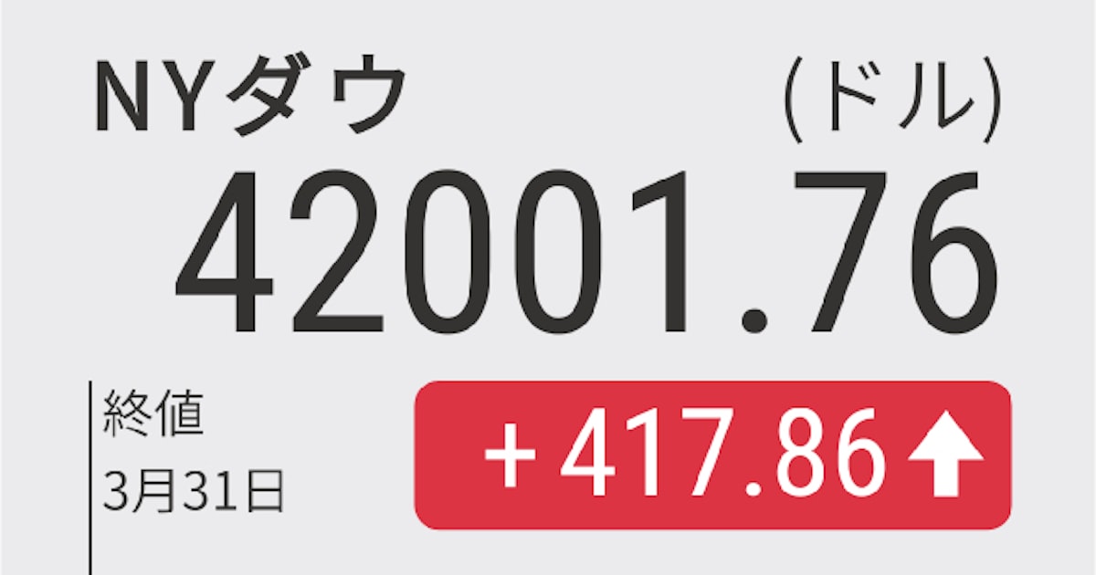- NYダウ工業株30種(ドル)3/31 17:30 終値42,001.76+417.86(+1.00%)
