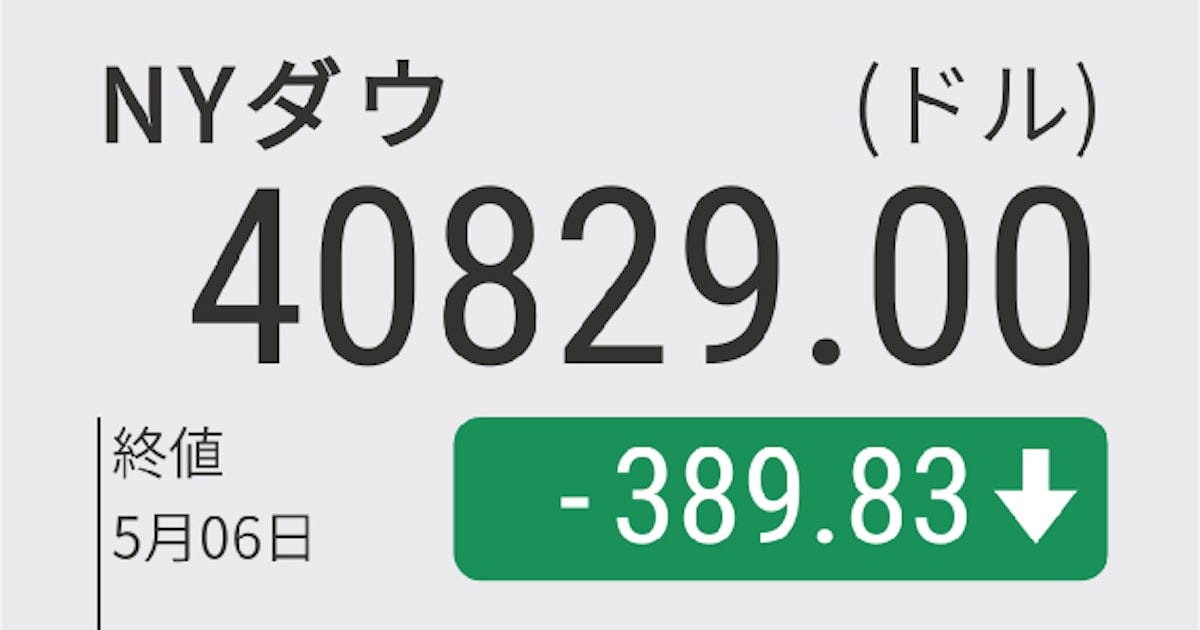 - NYダウ工業株30種(ドル)5/6 17:30 終値40,829.00-389.83(-0.94%)