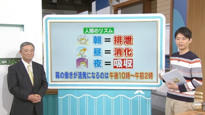 「人間の体には、朝は排泄、昼は消化、夜は吸収という動きが。腸の動きがもっとも活発になるのは、午後10時から午前2時くらいまでです。この時間帯に合わせて腸内環境を整えておくことが非常に大事なことなんです」と飯沼先生。