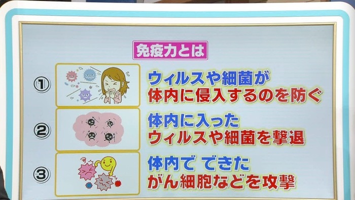 日本テレビ放送の「バゲット」では、「すぐに出来る!免疫力UP法」を紹介してました。