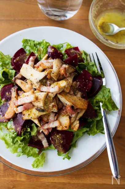 炒めたきのことベーコンに、ビーツを合わせた栄養満点サラダ。 甘いビーツには、酸味のあるドレッシングがよく合います^^ 鮮やかな赤色の野菜、『ビーツ』をご存知ですか? 「食べる輸血」と言われるほど栄養も豊富で、疲労回復やダイエットにも効果があるほど! 硬いビーツは火を通すことでやわらかくなり、甘さが引き立ちます。 サラダや煮込み料理などに取り入れると、いつものお料理が華やかに、栄養満点にもなります^^