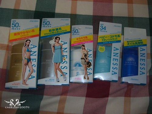 七月買的大金瓶+大銀瓶(最左邊兩瓶各60ml),旁邊還有小白瓶、兒童專用、專用卸妝蜜(各25ml):