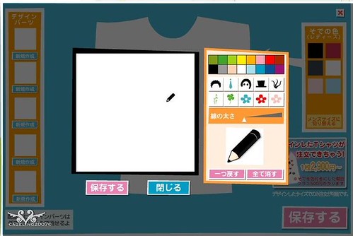 4. 接著可以看到空白的畫布、右方的顏色選取格、圖樣選擇、以及筆觸大小。最下方是可回到上一步驟的復原鍵【一つ戻る】與畫面全部消除鍵【全て消す】:
