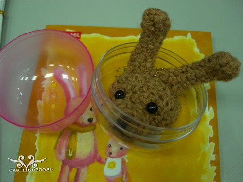 其實剛開始並不知道要做什麼給她好,加上鉤針娃娃我也才剛學不久,這隻是我鉤的第三隻(還不是全身的哩), 後來聽到她說家裡有養兔子,那我就想她應該會喜歡兔子吧,所以才決定做個小兔子吊飾給她。
