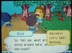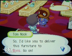 6. 對所有村民與村長自我介紹完後回到狸吉商店,狸吉會開始要你做送貨的工作囉! 以本次的教學是送家俱給Elvis~